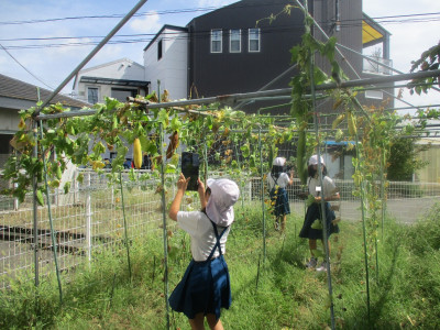 福音小学校には、本当にたくさん、いろいろな種類の樹木があります。桜やバラはもちろん、柿、ザクロ、金柑、ブドウ、イチジク、夏みかんなど、秋に実をつける木もたくさんありました。「これは何の木?」「こんな所にこんな実ができてる。」改めて見て、こんなにたくさんの種類の樹木があるなんて、すごいですね。
