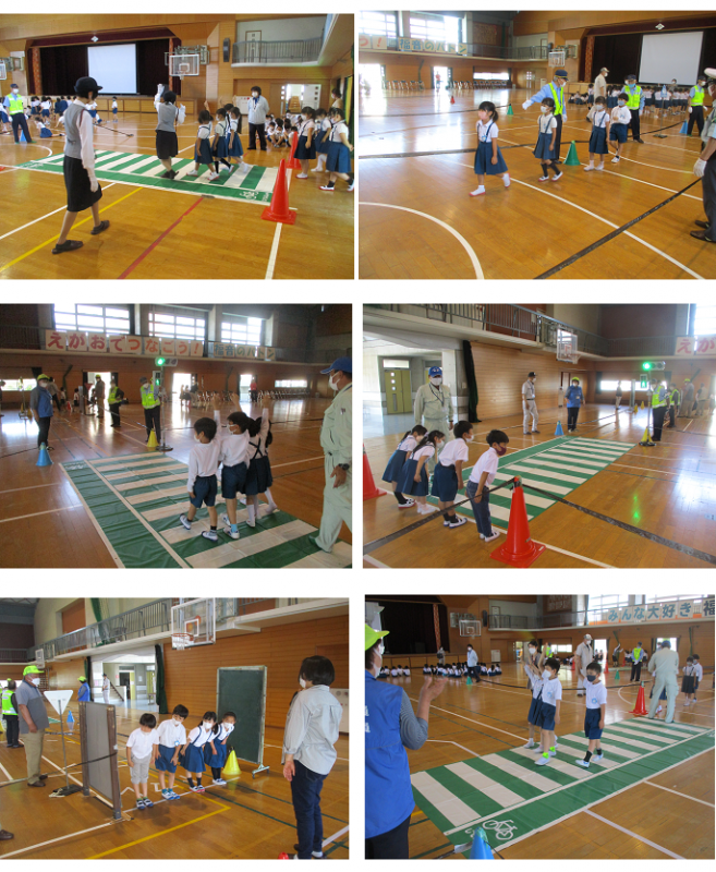 交通安全協会の方や地域の民生委員さん、登校時の見守りでお世話になっている方々など、たくさんの方に来ていただき、1年生に道路の歩き方や横断歩道、踏切などの渡り方を教えていただきました。
