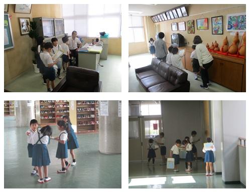 今日の学校探検は、1年生だけで行います。「2年生スペースは、どこにあるのかな」「校長室に行ってみよう」、グループで相談しながら、上手に校内探検する姿に驚きます。きらきら福音っ子にぐんぐんと成長しています。