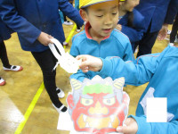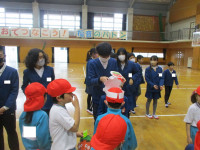 終わった後には、1年生から6年生に「楽しませてくれてありがとう」、6年生から1年生に「楽しんでくれてありがとう」と言い合うという心温まる豆まきでした。1年生は6年生からお面と折り紙で作ったプレゼントをもらって、大喜びでした。